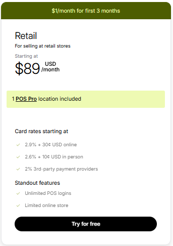The Retail plan costs $89/month and is designed for businesses with physical stores that need more advanced POS features.