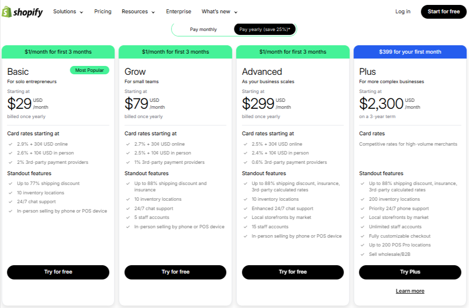 As your sales increase, you can move from Basic to Grow, then to Advanced or Shopify Plus for enterprise-level needs.
