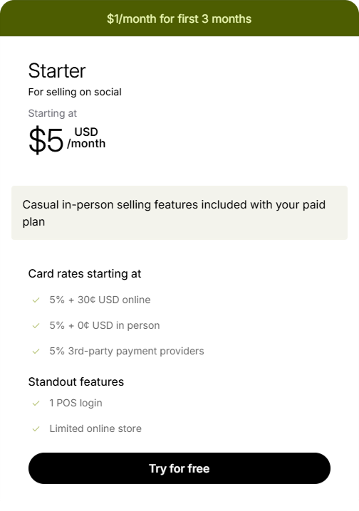 • Starter Plan begins at $5/month, great for selling via social media and messaging apps.