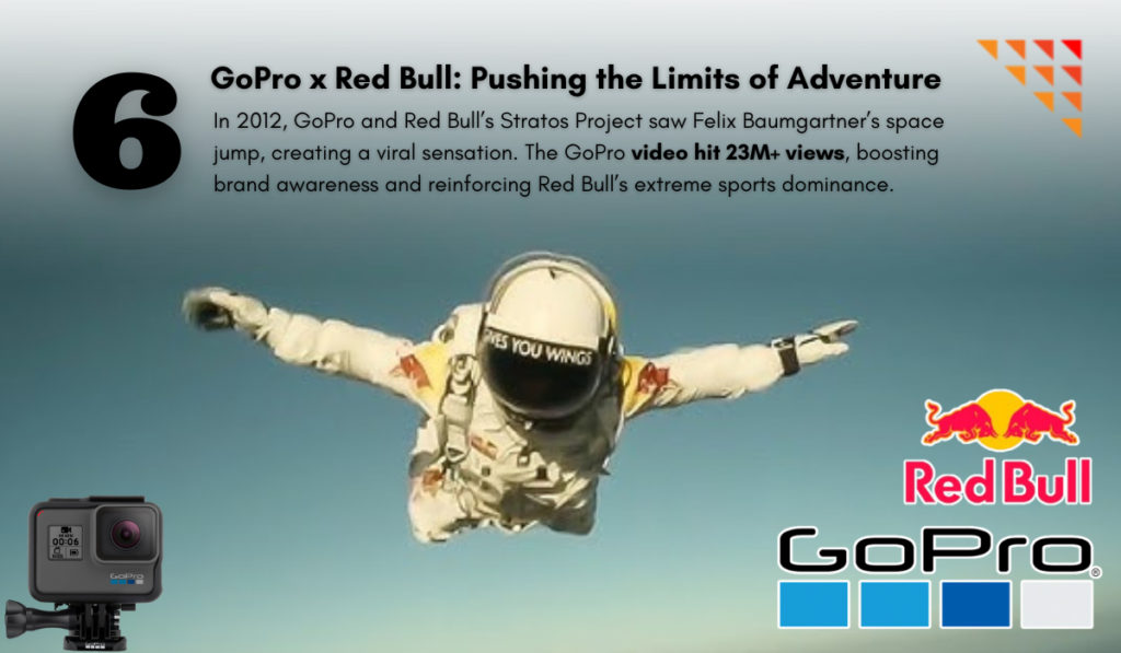 In 2012, GoPro and Red Bull teamed up for the Stratos Project, in which skydiver Felix Baumgartner jumped from the edge of space. This collaboration combined Red Bull’s extreme sports branding with GoPro’s cutting-edge camera technology, leading to a viral sensation.