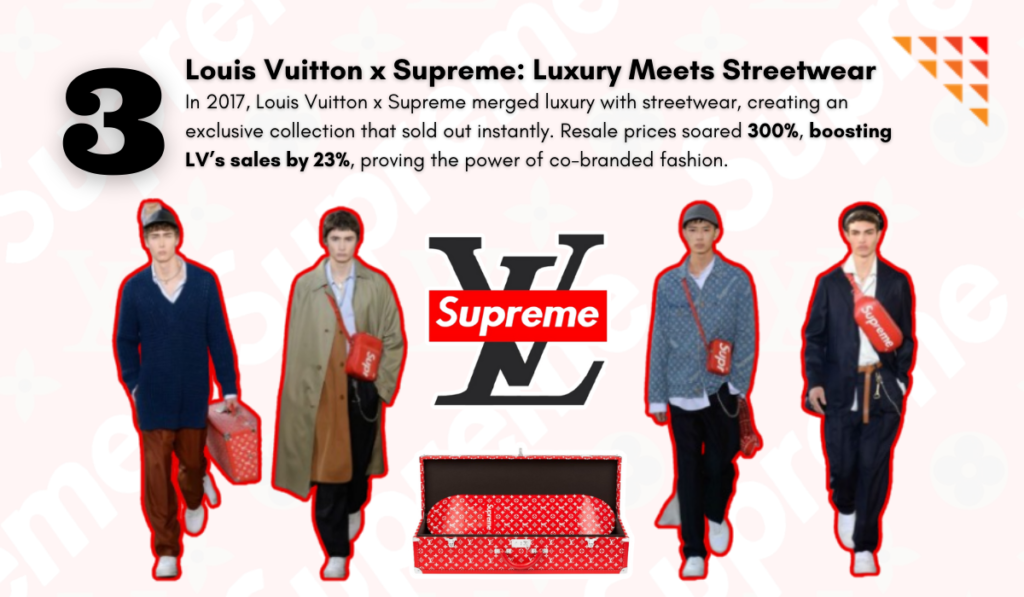 Impact: The collection sold out instantly, with resale prices surging 300% above retail. Louis Vuitton’s sales jumped 23%, proving that co-branding can fuel massive revenue spikes.