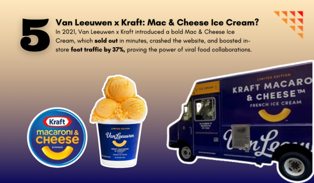 In 2021, Van Leeuwen Ice Cream and Kraft teamed up to launch a macaroni & cheese-flavoured ice cream. While the idea seemed outrageous at first, it quickly went viral, generating buzz across social media and selling out within hours.